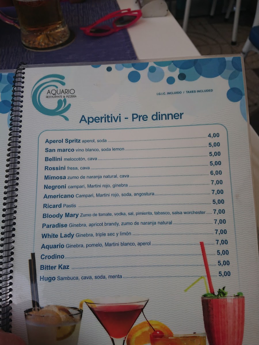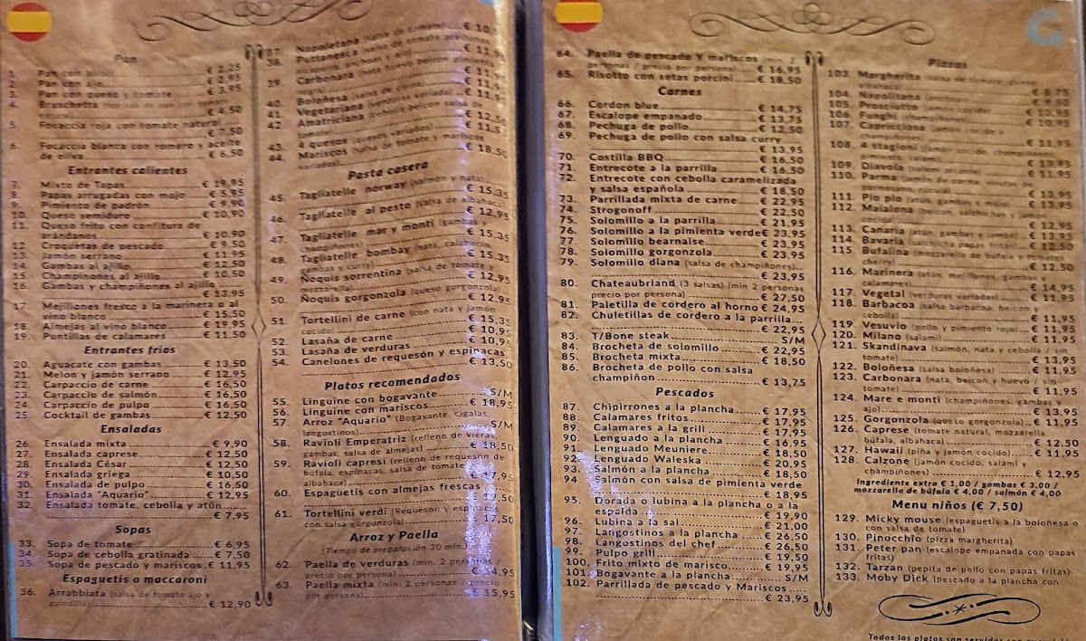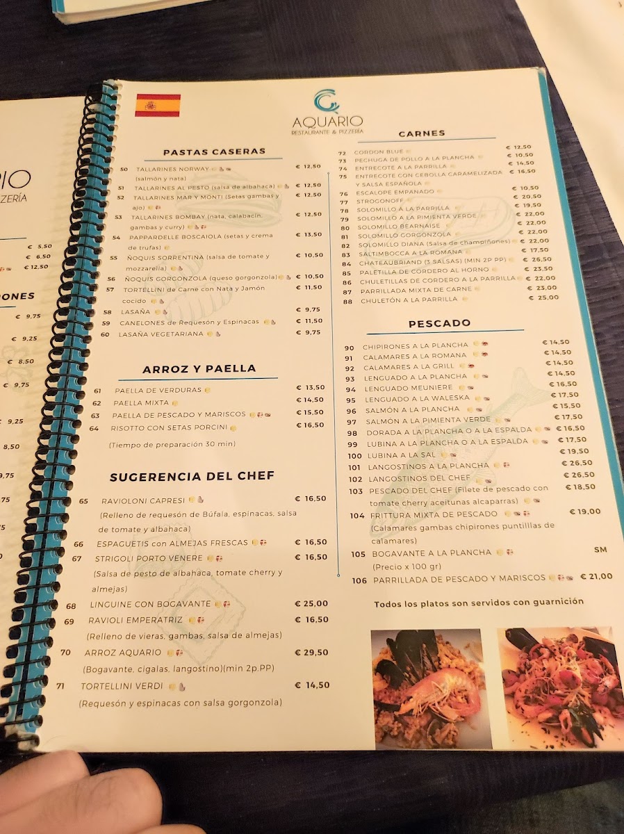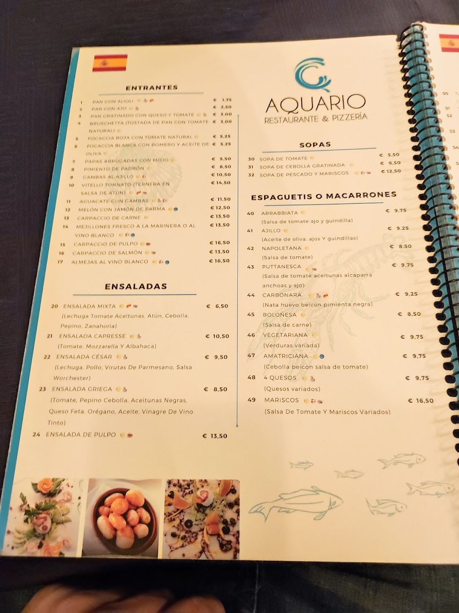 The menu at Aquario Restaurante & Pizzeria offers a range of Italian, Mediterranean, and seafood dishes. It is organized to include various types of meals, from traditional paellas and grilled seafood to classic Italian pasta and pizzas. Visitors can expect options such as mixed seafood and meat paella, steak, dorado fish with roasted garlic, linguine frutti di mare, and grilled octopus.