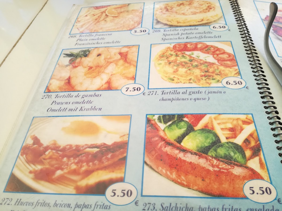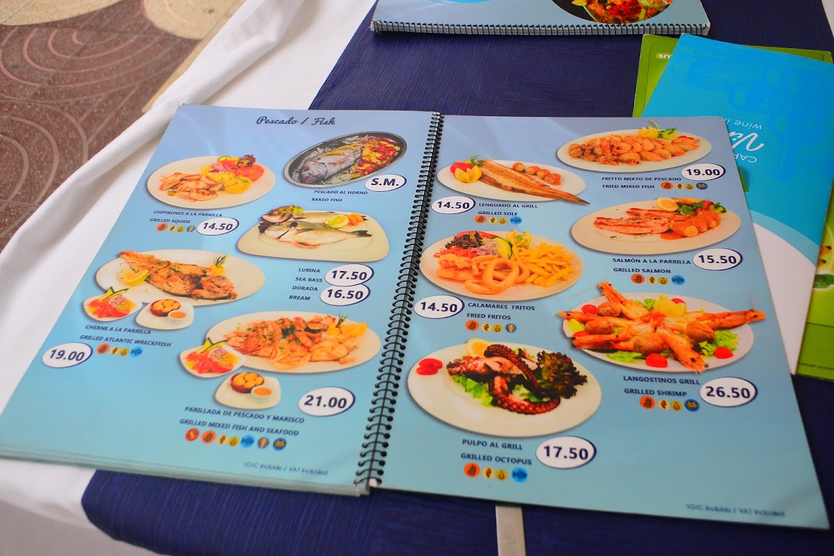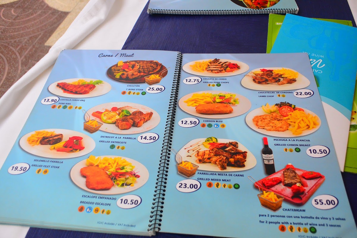 In addition to main courses, the menu features popular regional sides like Patatas Canarias and fresh fruit salads. There are also lighter fare options such as calamares and fried mixed fish. The dessert selection includes items like chocolate brownie and fruit-based choices.