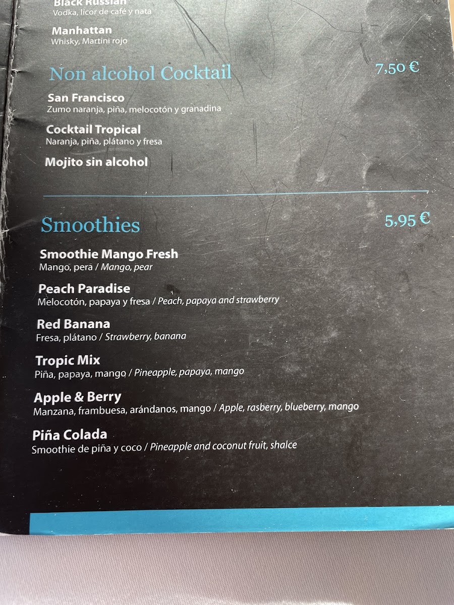 The beverage offerings include a variety of cocktails and regional drinks, such as sangria and Aperol Spritz, as well as smoothies like mango smoothie. The menu is suited for casual dining and can accommodate both quick meals and more leisurely dining experiences.